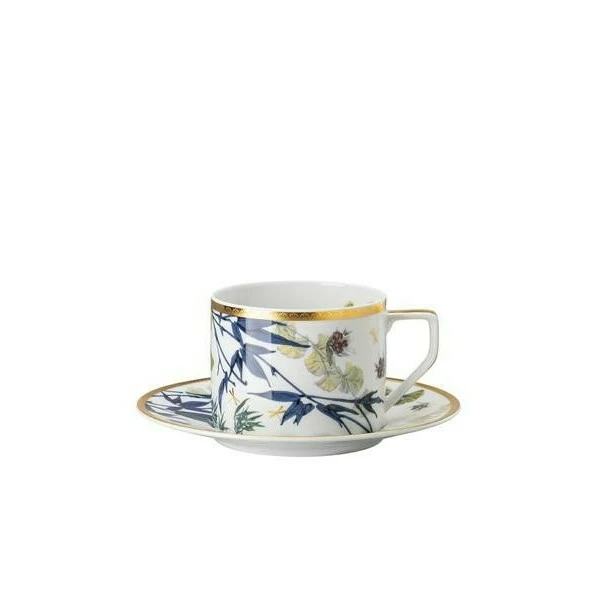 Märchenhaften Genuss können Sie mit der Kombi-Tasse mit Untere der Serie Heritage Turandot White von Rosenthal erleben. Das Dekor mit den gedeckten Farben im orientalischen Stil, ist geprägt von Pflanzen, Blüten und fröhlichen Libellen. Akzentuiert wird die harmonische Komposition durch zarte Goldeffekte.